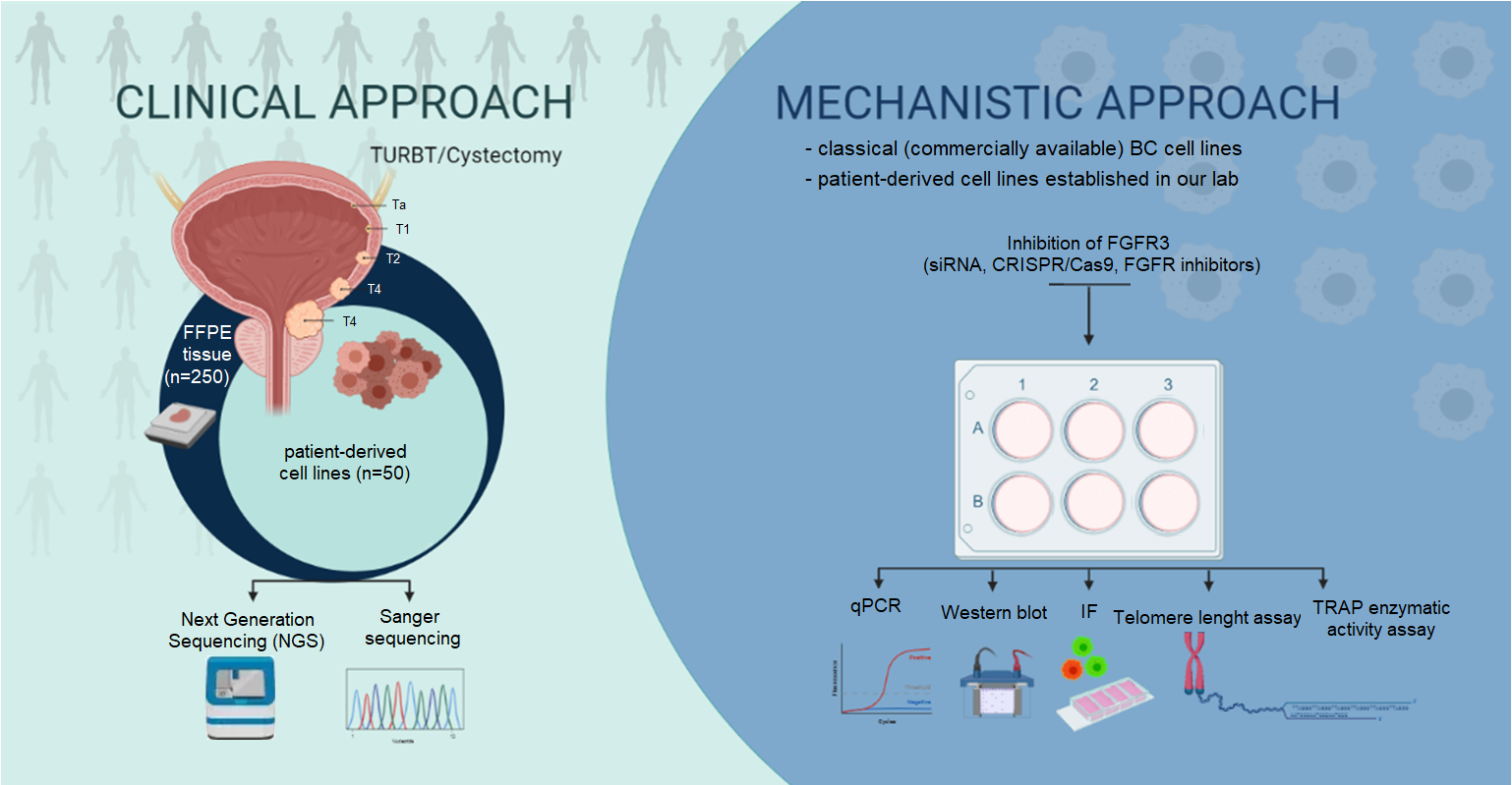Aus diesem Hintergrund heraus haben wir es zum Ziel dieses Projekts gemacht potentielle Interaktionen zwischen FGFR3 und TERT zu erforschen, wobei wir einerseits einen mechanistischen und andererseits einen klinischen Ansatz verfolgen. Unter Verwendung von sowohl klassischen Blasenkrebs-Zelllinien, als auch Zellkulturen, die in den letzten Jahren in unserem Labor aus Patientenmaterial gewonnen wurden, planen wir verschiedenste in vitro Experimente durchzuführen. Unter anderem werden wir FGFR3 durch Knockdown bzw. Knockout deaktivieren und den Effekt auf die Expression von TERT und die Telomerase-Aktivität evaluieren. Wir werden auch den Einfluss verschiedener FGFR-Inhibitoren (z.B. Erdafitinib) auf TERT erforschen.