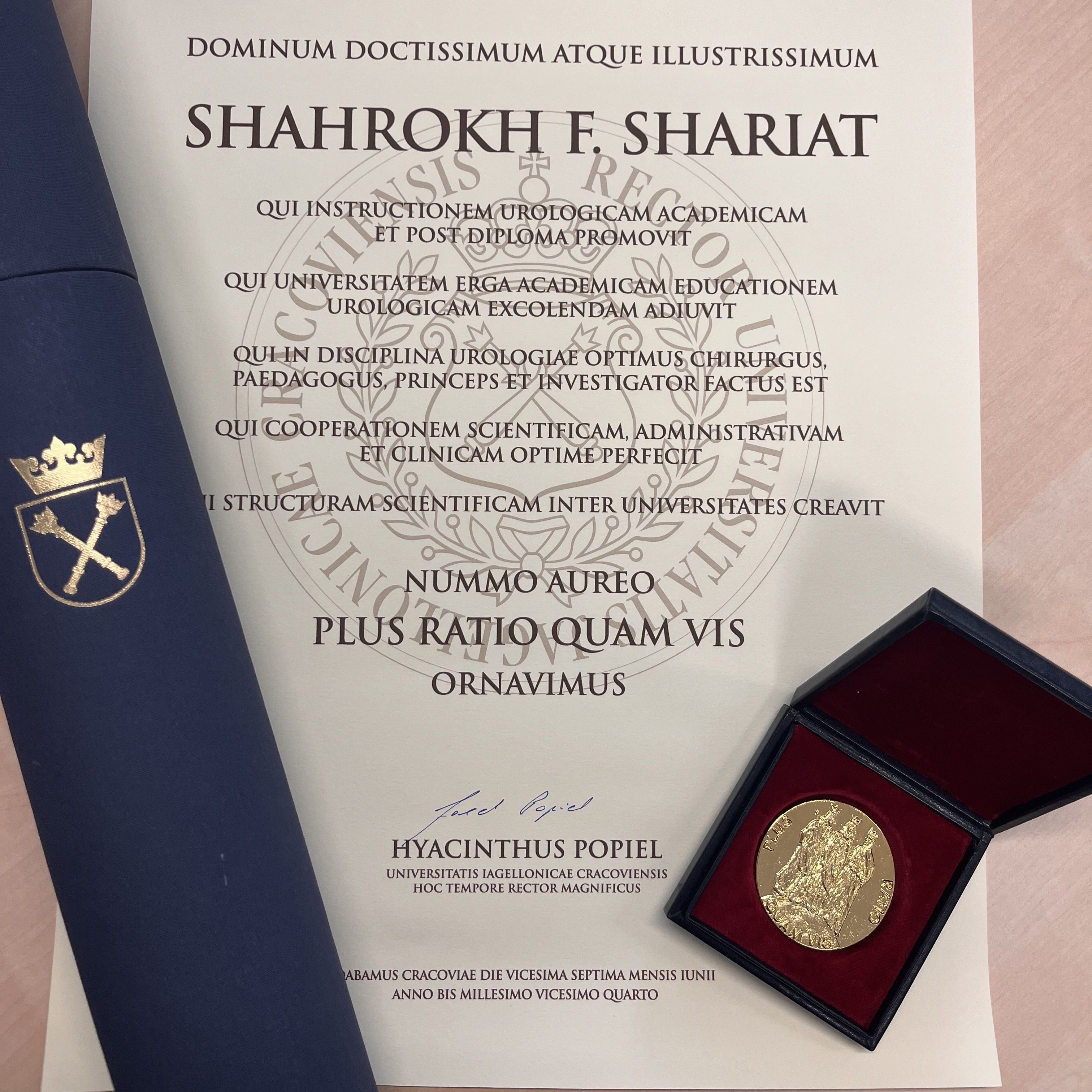 Der Vize-Rektor der Jagiellonen-Universität für das Collegium Medicum, Prof. Grodzicki, hob folgende Verdienste hervor, die zur höchsten Anerkennung der Universität führten und Prof. Shariat herauragend hervorbrachte: die Förderung der akademischen und postgradualen urologischen Ausbildung, herausragende Beiträge zur Wissenschaft der Urologie als Chirurg, Ausbilder, Führungskraft und Forscher, die wissenschaftliche, organisatorische und klinische Zusammenarbeit sowie die Schaffung einer interuniversitären wissenschaftlichen Plattform.